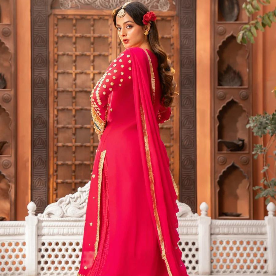 Embrace traditional beauty with a touch of glamour in this Gulaabi (Rose Pink) Embroidered Chiffon Suit. This feminine, romantic ensemble is ideal for festive occasions like mehndi, dholki, Eid, and bridal events — blending modern elegance with a classic desi touch.