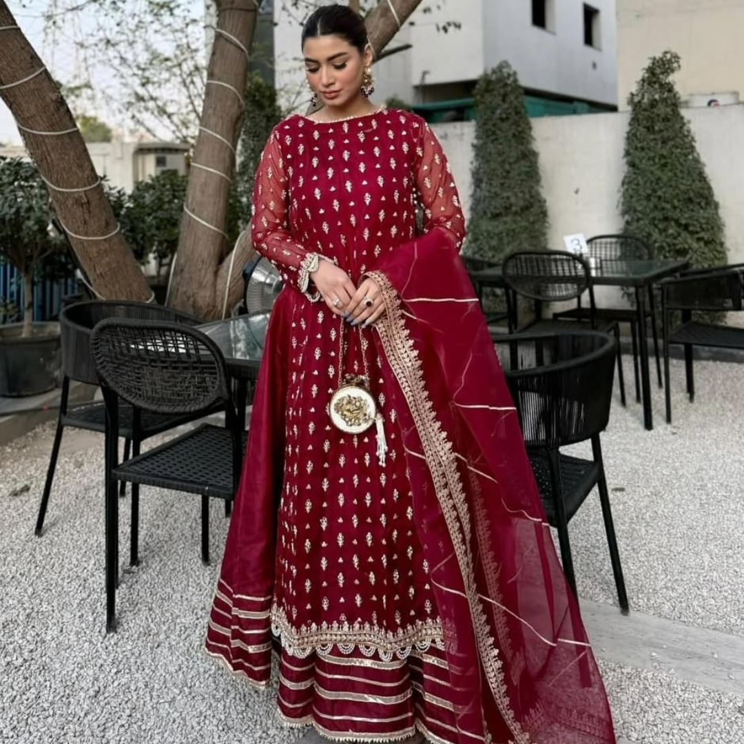 Step into a world of regal beauty with this Maroon Luxury Embroidered Chiffon Suit. Crafted for celebrations, this deep and rich tone of maroon is enhanced with gold zari, sequin, and resham embroidery — perfect for weddings, barat nights, or formal festive wear.